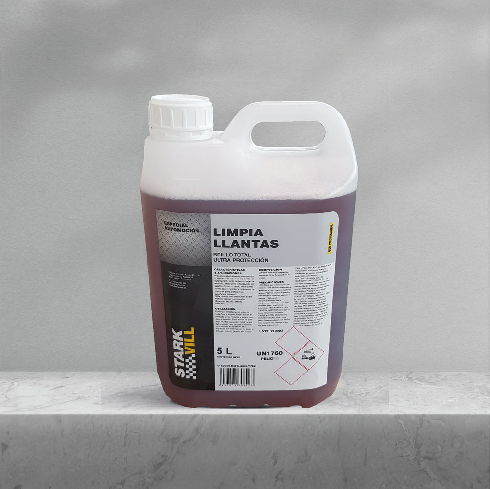 El limpia llantas tiene una gran potencia limpiadora que disuelve todo tipo de suciedad, incluyendo cal, polvo de freno y óxido. Con un solo gesto y el envase de 5L, conseguirás una limpieza profunda, un brillo duradero y la eliminación de la grasa en tus llantas.
